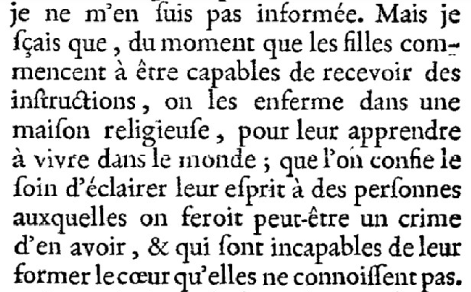 Elles ne sont pas mieux instruites sur la connaissance du monde, des hommes et de la société. Elles ignorent jusqu’à l’usage de leur langue naturelle. Il est rare qu’elles la parle correctement.